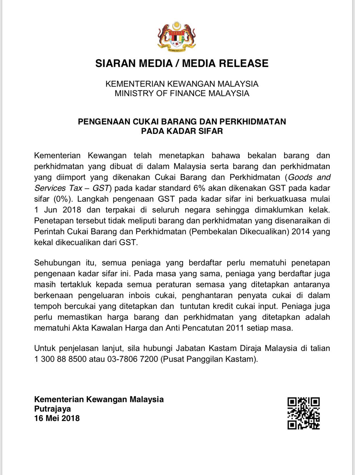 Nuradilla Noorazam On Twitter Tidak Lagi 6 Gst Kini Berkadar 0 Berkuatkuasa 1 Jun 2018 Semua Peniaga Berdaftar Harus Mematuhi Penetapan Ini Dan Masih Tertakluk Peraturan Semasa Yang Ditetapkan Harga Barang Juga