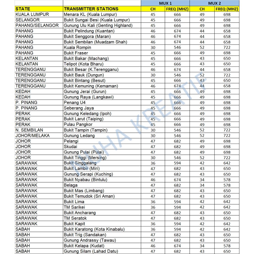 Malaysia List Frequency Pemancar Mytv 2019