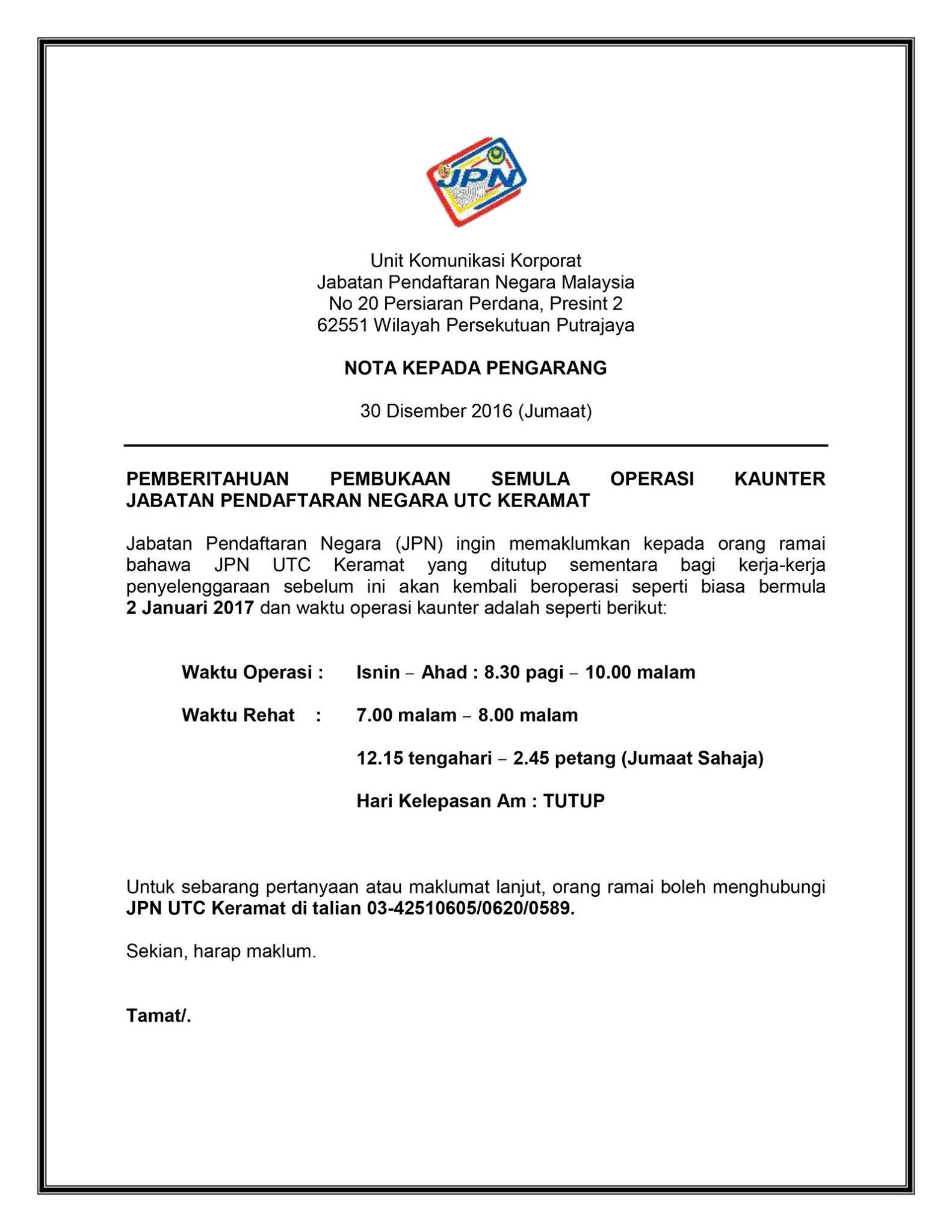 Jpn Malaysia On Twitter Pemberitahuan Pembukaan Semula Operasi Kaunter Jpn Utc Keramat 1jpnm Rakyatdihatijpn